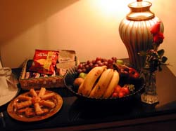 カイロ到着後、メリディアンヘリオポリスにチェックインすると、旅行会社のマネージャーからウエルカムフルーツと高級エジプト菓子盛り合わせ(左・エジプト菓子の常で死ぬほど甘い)が贈られていた。思わず叶恭子になったみたいで気分良かった。セレブといえば叶姉しか出ない辺りがナニではあるが・・・ クレオパトラ気分で浴槽につかり、房ごと持ち込んだブドウを食べて高笑いしたりしてたんだが・・・思い起こせばこの到着当日の長湯&湯冷めが原因で、後日腹をこわした気もする。