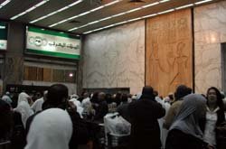 空港で荷物が出てくるのを待つ人々がわんさか。 丁度「ハッジ」と呼ばれる年に一度のメッカへの巡礼が終わった頃だったので、空港は白装束の巡礼帰りの人々で溢れかえっていた。バックに見えるアラビア文字と「取りあえずラムセスでいっとけ」な壁のレリーフに、ああまた埃っぽい国に来てしまった・・・と感じる。