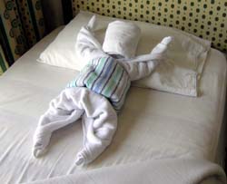 部屋に入るなりこれがお出迎えだから思わずずっこけた。腹巻き部分の縞タオルは私個人のものを使用しているのがまたなんとも・・・兄ちゃんにチップをはずんだのは言うまでもない。