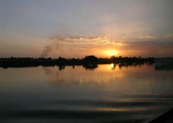 船室から臨む日没直前のナイル。ベッドに寝転がったまま西岸に沈みゆくラーの船を見られるのは船旅の醍醐味である。あ〜生きててよかったと思うひととき。