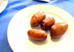 揚げたイモではない。古代エジプト人もおやつにそのまま食べたり、パンやお菓子に焼き込んだりしたかの有名なナツメヤシである。干したものは見かけるが、ナマのものは初めて見たので激写。 皮付きのイモの煮っころがしのように皮がするっとむける。種は平べったい。味は・・・強いて言えば金時イモのような柿のような。 古代エジプトには砂糖がなかったので甘味料といえばこれやハチミツで摂取していた。飽食した現代人から見るとその慎ましさがなんかラブリーv