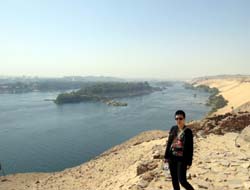 アスワン西岸の岩窟墳墓前よりナイル上流を臨む。 この辺りには緑の小島が点在し、青く輝くナイルと相まって心が洗われるほどに美しい。 死後、このような気持ちのいい場所から遙か彼方を眺めたい、と願った古代エジプト人の思いが伝わってくるようで、ここはテーベ西岸と並んで、私が今まで行ったあらゆる場所で最も好きなところである。
