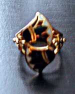 18金にラピスの瞳孔なのだが、透かし彫りで金の量が少ない割に高いんじゃかろうか。だが、これも他の店では日本の御神輿のように飾り立てられたデザインばかりで、こういうシンプルな物は無かったため、まぁ仕方ないかと無理矢理自分を納得させたブツである。 |
