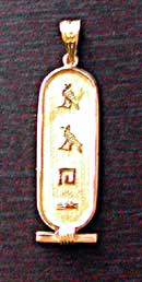 モノの本によれば、カルトゥーシュとはフランス語で「銃の薬包」の意味で、ナポレオンの編成したエジプト調査隊の人々が王名を囲んだこれを「カルトゥーシュ」と呼んだのが始まりとのこと。 アルファベット化した名前をかなり力づくでヒエログリフにあてはめ、カルトゥーシュに彫ってもらう・・・これはエジプト土産としては最もポピュラーな物なのだが・・・問題なのはここに彫ってある名前。 ・・・ハイ・・・そうですね(笑) 実はこのアルファベットのスペルをどうするかが私にとっての最大の問題点。古代エジプト人の名前を発音から一旦アルファベットに置き換え、さらにヒエログリフに戻す・・・そんなこと無理ありすぎである。 でも私はここまで来たからには言ってみたかった。「マハードって彫って下さい」と・・・きゃっ!!杏子並みに乙女だわ! ただ、インドのマハード市の綴りは"Mahad",サウジのマハド・エル・ザハブの綴りは"Mahd"、可能性としては"Mahard"も捨てきれない・・・ そこで私は現地ガイドのオムル氏に尋ねてみた。 ・・・初めてサシで放った言葉がこれかよ! でも帰ってきた返事は残念ながら「いや〜、エジプトではそんな名前聞いたことありませんねぇ」というもの。 チッ!残念!和希先生、神官ズの名前をどこから拾ってきたんだろう・・・是非とも知りたい点であるが、突撃インタビューの叶うお方ではないので、真実は永遠の闇の中・・・ 話戻って、結局カルトゥーシュに彫ってもらった綴りは"Mahd"にした。なんだか一番アラブ風だったしな。いや、マハードはアラブ人じゃないんのだが・・・ 店のアンちゃんに綴りを見せ「これって何て読む?」と尋ねると「マハッド」という答えが返ってきたのでまぁいいか。・・・というわけでできあがったものが上のカルトゥーシュ。18金、長さ4センチにて340ドル、高いやないかい!!(怒) でもこれ、ツアーで連れて行かれた旅行会社御用達の店だったのだ。価格交渉不要ってやつ。同行のツアーメンバーも皆これを買っていたが、実際かなり高くついたと思うなぁ。