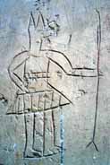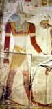 右のアヌビスが神殿の内部に描かれたもの。宗教的弾圧から身を守るため、神殿内に身を隠して生活するのは最初はスリリングだったろうが、どうもその内ダレが生じてきたと見える。<アビドス・セティ一世神殿> |