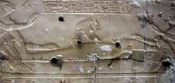 かの有名な神話「死んだオシリスの上にのしかかってホルスを受胎するイシス(トンビVer.)」図なのだが、このチ○コ部分の削りっぷりからは、一滴たりとも精液見逃すまじ!という異教徒の固い意志が伝わってくる。<アビドス・セティ一世神殿> |