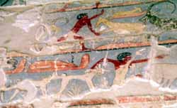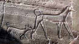 ![]() 古王国の私人墓壁には、かなりの高確率で登場するバセンジー・タイプの犬がここにも。 耳をピンと立てたキツネ顔で、尻尾は太鼓型に堅く巻きあがり、「吠えない犬」として名を知られた現代バセンジーにかなり近い。 |