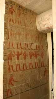 ![]() 「マスタバ」とはアラビア語で「ベンチ」の意味だが、その名の通り上部構造が泥レンガ製のベンチの形をしている。 私はかつて一度だけこの墓をカタブツの友人Y氏以外のエジプト人と訪ねたのだが、その時のガイドさんは「ここって『兄弟の墓』と呼ばれてますが、実はホモの墓なんですよね〜!ほら、見てください指とか絡ませてますから!ワハハ〜!」とズバリなことを言っていたからには、二人が恋人同士だったのは実のところ周知の事実なのかもしれない・・・ |