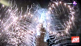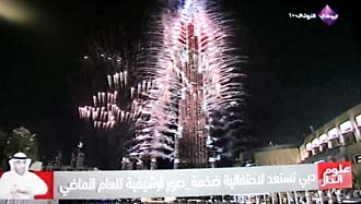 ![]() その頃、ドバイの金満ビル、ブルジュ・ハリファでは50万発の花火が打ち上げられていた。 |