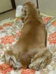 組織は人なり、とよくいうけれど、人の部分から削ってお上は一体なにをやってんのやら。心おきなく入らせてやれよ、風呂くらい。 洗濯して本来の色を取り戻した毛布を取り込んで敷き、もう一度ベランダに出てからふと部屋を振り返ると、マヤがこういうポーズのまま石化していた……。犬ってバカ。それにしても犬ってどうして洗濯したてのものの上に乗りたがるのだろう? |