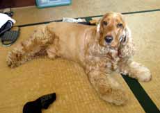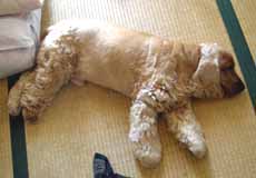 通りすがりに開店前のこの店をのぞくと、5枚くらい重ねられた座布団の上でこいつが丸くなって、自分の爪などをガジガジかんでいた。 そのなーんも考えていない姿を見ると、さまざまな怒り(主に為替問題)もつかの間消え去り、思わずへろへろ〜〜と脱力。犬って平和よねえ。 |