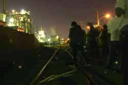 ツアーのために特別に開放されたビルの屋上から、なにかに憑かれたかのように工場を激写する人々。