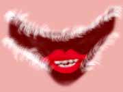 山積みのおばはんパンツとは一線を画し、うやうやしく壁面に飾られた問題のパンティーは、左図のような代物。真夏にクリスマスがやってきたのか?と見まごうサンタカラー&ふわふわ付き。(絵はクチビルをきわだたせるため実物より黒っぽく塗ってます)