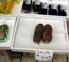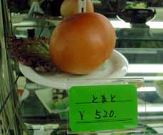 上野の焼肉店のショーウインドウにいたふてぶてしいトマト。せめて切れと言いたい。そして高い。