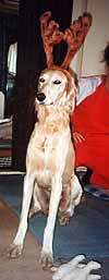 クリスマスにはトナカイさんにへんしーん!「シカみたいなイヌだね!」とよく言われるサルーキだからこそ似合ったコスプレだ。これならせんとくんコスもできたかもしれない。