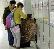 八重洲口のコインロッカーで苦しむ人たち。押し込もうとしているのはMade in インドネシアっぽい籐製のなにか。ありゃ入らんだろ?と思いながら見守っていたら、無理矢理入れた。400円コインロッカーのキャパシティーに感服。
