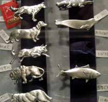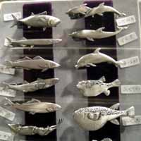 新橋の洋品店に生息する多種多様なネクタイピンたち。左上からクロマグロ、サンマ、キス、イワシ、あゆ、イカ、二匹イルカ、イルカ、河イルカ、ふぐ(小)、ふぐ(大)・・・・・・。
