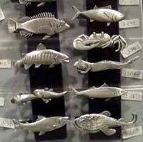 こんなに多品目を作ってニーズがあるのかな?誰がフグ(大)フグ(小)のネクタイピンなんぞ買うんだろう?と思ったけど、目をこらすと「とびうお」「いわな」「スペースシャトル」といった部分にちょくちょく欠落が見られる=販売済み。うーむ。