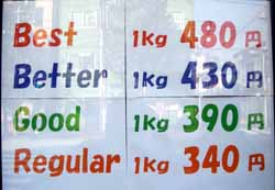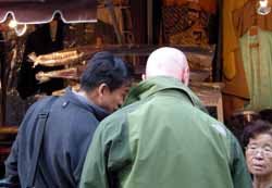 いつも不思議に思うのは、この手の店は浅草に限らずどこでも見かけるってことだ。こんなえげつない色柄もの、一体どこで着るのかと思ったら、どうもカラオケの発表会でここぞとばかりに披露するらしい。