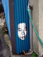 ギャ──!顔がぁ──っ!左の建物のトタン部分に貼られた写真。夕暮れ時だったのも相まって、角を曲がるとこれがあった時には背筋がぞぞぞとした。
