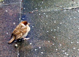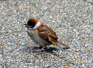 まだろくすっぽ飛べない子スズメいっぴき。巣から飛び出したはいいけれど、おかあちゃんはいないし、どうすればいいか分からなくて途方に暮れているのだろう。
