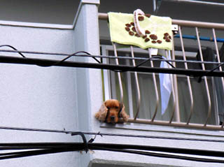 父も母もイリも、生きていた頃はこうしてベランダから仕事に行く私を見送ってくれた。今はマヤにバトンタッチ。いつまでも首を出している犬を見ると、胸がぎゅうっとなる。