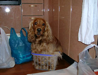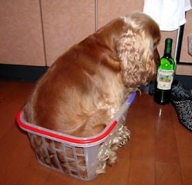 料理をしているとタタタ……と駆けてきたと思ったら、なんのためらいもなくすっぽりカゴに入ったさわやかコッカースパニエル。