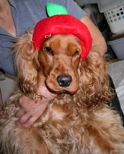 おリンゴの帽子をかぶせられてむくれてます。葉っぱまでつけてバッカでぇ〜(笑)