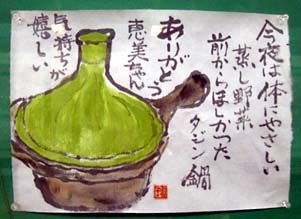 生徒「先生、何を描けばいいか思いつかないんですけど」講師「なんでもいいんですよ。絵手紙は日常の小さなできごとを表現するものですから」という会話が聞こえてきそうな作品。けどタジン鍋って描くの、あんまし楽しくない気がする……。