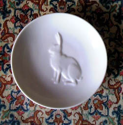 どうしてこんなに暗くしてるんだろう?とひそひそ話しながら(閉店間際だったと後に判明)ショーウインドウをのぞき込むと同時に、小さな白い皿が目に飛び込んだ。まったりした白に野ウサギが浮き出している。