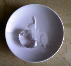 家に帰って包みを開けると、ウサギがいなければ100円ショップで買えるようなこんな皿に5千円は高かったかなあ、とちょっぴり後悔が頭をもたげてきた。毎日節約してるのに、衝動買いしちゃ駄目じゃない。