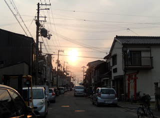 三丁目の夕日。右手に見えるのは恵比寿神社。漁師の守護神だけあってこの近隣にはやたらと多いんだ。