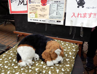 商店街にある明石焼き屋の店頭で、10年前から寝ているワンちゃん。10年前に比べると、客になでられて毛が薄くなったような……。