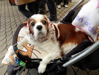 足が立たないから乳母車で散歩に連れてきてもらった12才のお年寄りワンちゃん。マヤちゃんももうすぐこうなるのかな。