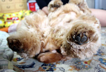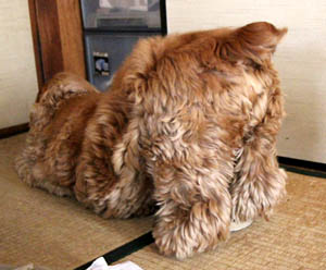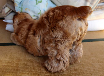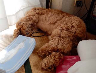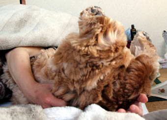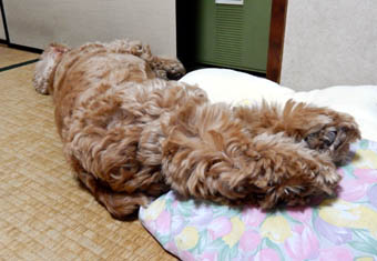 2015年5月26日(火) 自宅では不眠気味の私だが、マヤがいる実家ではよく眠れる。カナを発見した時の情景がフラッシュバックして呼吸が辛くなる夜も、犬のいびきがぷすぅーっ、ぷすぅーっと聞こえてくると、ほっとしたようなアホくさいようなでまた眠りに落ちることができるんだ。 マヤの定位置は私の布団の上、足元のあたりで、私がいない夜にはヘボピーの布団に移動する。 おまけに12キロの漬け物石を乗せているようなものだから、布団を引き上げようとしても上がらない!無理に引き上げると綿が切れそうになるから諦めるせいで、ヘボピーなんか冬になると肩を冷やしていつも鼻をぐすぐすいわせている。 そしてマヤのもう一つのきめごとは、「夜中に人間がトイレに行く時にはついていく」ことらしい。 いったい何がしたいんだか。自宅警備員としての役目を果たしているのかもしれないが、そんなマヤのことを私たちは「妖怪厠(かわや)のぞき」と呼んでいる。 そういえば父は生前、私が実家に帰ると「おまえらがいるとマヤが俺の布団で寝なくて困る」と不平を言っていたものだ。 では今夜も妖怪厠のぞきのいる家に戻ってくる。犬に乗られて薄汚れて、綿が切れた布団はけして寝心地がいいわけじゃないんだけどね。