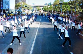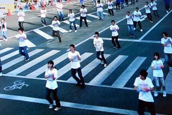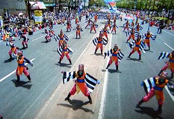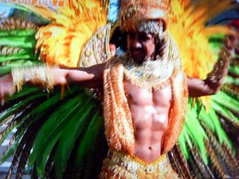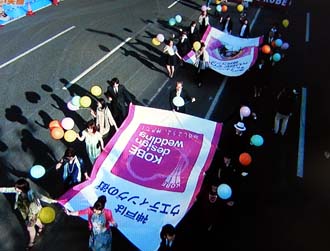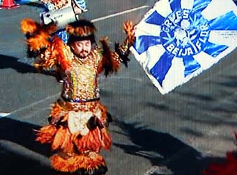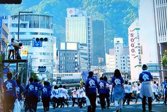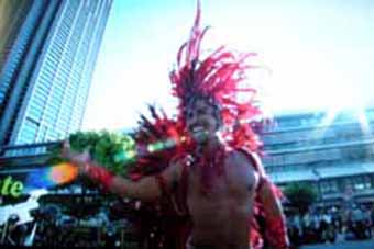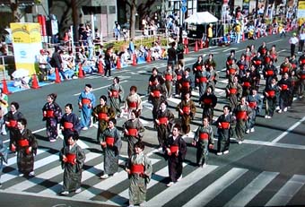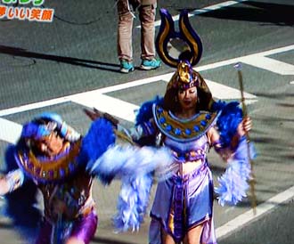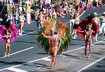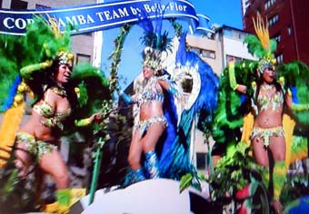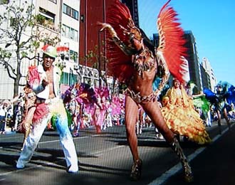 2015年5月19日(火) あぁああぁぁぁああ────っっつっつつ!! 神戸まつり、見逃したぁ──っつ!!!!! 土曜日に整骨院に行った時に、ゆかたおばちゃんたちが踊りの練習をしてる横を通りかかったんだ。 むちゃダサな神戸まつり音頭にあわせて、真剣きわまりない顔で両手に持ったピンク色の紙の花を上げたり下げたりするおばちゃんたち。実にダサい、どん臭い。だが40年前から変わらぬそのどん臭さが、今の私には慕わしい。 感傷にひたる私のまぶたの奥に浮かぶのは、地平線まで続くおばちゃんの群れ。千人もの老女がアスファルトの熱気で蜃気楼のようにゆらめきながら、三歩進んで二歩下がり、牛歩戦術で見る者すべてをうんざりさせる。 ゆかたおばちゃんたちのの最終調整を眺めながら、去年、サンテレビの神戸まつり中継を見ながら心に決めた誓いを思い出した。今年こそ中継ではなく、現地に行ってパレードを激写すると決めたのだ。 ……だというのに、最近うっかりさん連発の私は、開催日の5月17日は来週だと、一ミリ、いや1ミクロンの疑いもなく勘違いしとったわ! かなりショックだ。すごく楽しみにしてたのに……。当面の楽しみは神戸まつりしかなかったのに……。 あーあ、「あの人」の今年の衣装はどんなだったんだろう。見たかったなあ。「あの人」とは某サンバチームの男性ダンサーなんだけど、今年はどんな衣装か楽しみにしていたのだ。 それではうっかりさんな自分には後ほど罰(うさぎ跳び20回)を与えることにして、昨年の神戸まつりパレードの絵でものっけていきます。