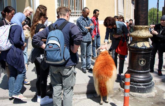 エキサイトした人々に次々と記念写真を乞われても悠然としている。若いママともパチリ。こいつぁプロ羊だ!