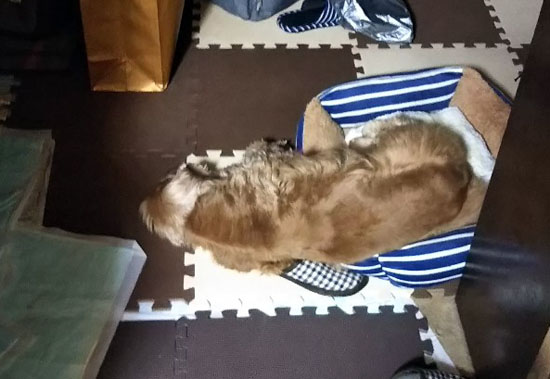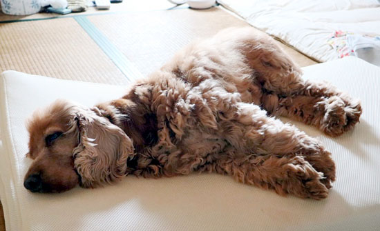 まだかろうじて「要介護」になっていないのに、フライングで購入した「寝たきり犬用ベッド」でたゆたう老犬。