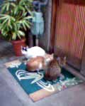 私がしばしば出前を取る近所の寿司屋(特上にぎり1800円也)の玄関先で、常時スタンバッている猫ども。じっとガマンの子でいれば、いつかマグロの切れっぱしが天から降ってくるのだろう。