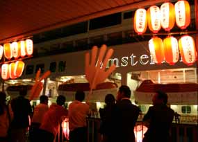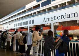 2007年10月6日(土) ![]() おはようございます。 私はと申しますと、“PS元気ですミキ”って感じですのでご安心ください。 今日のお船・アムステルダム号は地元初入港。入港7時ゆえ余裕をもって目覚ましをかけていたのだが、カメラの電池が空なことを忘れちょったわ・・・・・・ ギリギリの量を充電の上、二日酔いの体にムチ打ってチャリをぶっ飛ばした結果、現地到着6:45。 朝日を浴びながらゆっくりと近づいてくる入港シーンを見ようと、3ヶ月前からこの日を楽しみにしてたのにさ、ちょっと読みが甘かった・・・・・・とはいえ、久々に目にする外国客船には、思わず涙ぐむほどゾクゾク。やっぱいいわぁ、巨大船。萌え死にしそうだ! ←早起きは年寄りの専売特許。朝っぱらからスタンばる元・カメラ小僧、現・カメラ爺たち。 ただ、今回初めて目にしたアムステルダム号、日本郵船の誇る国産客船の最高峰・アスカ様と比べると、ちょっと造りが粗いというか格落ち感が否めない。長さ的にはほぼ同じだし、体重はMs.アムステルダムの方がアスカ嬢より一万トンほど重いはずなのだが。 ただ、その飛鳥2にしても、「QE2(クイーンエリザベス二世号)をサンタマリア大聖堂とするなら、飛鳥2は六本木ヒルズ。装備は最新かもしれないけどてんで品格に欠ける」などとクソミソにけなしてたのだが・・・・・・ 今回アムステルダム号を見て、アスカ様の船体がどんだけリュクス感溢れるものなのか、よーく分かった。Holland America Inc.の営業担当には刺し殺されそうだが、飛鳥2を六本木ヒルズとすると、アムステルダムはレ○パレスの賃貸マンションって感じ。 QE2の場合は外から見えるのは主にバーやホールだったのだが、アムステルダムはウナギの寝床みたいにずらっと並んだ客室がまず目に入るのだ。