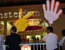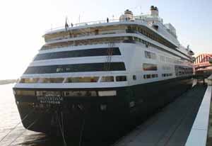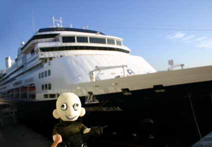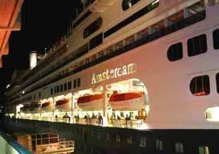 テラスの造りも、ぶっちゃけどこの木造ハイツって雰囲気だもんで、こうやって港で見るだけならいいけど、この船でクルーズにはあんまし出たくないなぁと思ったのが正直なところ。 ←加納典明気分でヒップから激写。さすが全長238m、いいね、いいねぇ〜!その遠近感! ゴメンね、Ms.アムステルダム。けちょんけちょんに言って。とはいえさすが2002年度のシップオブザイヤーだけある。瀬戸内海に就航中のフェリーとかと比べると、断然格違いの美船さんですねっ!(一応フォロー)