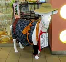 福知山名物・ヤギのチーズ&ミルク入りまんじゅう「やぎのたまご」のプロモーションのため、ヤギ(の像)が駅売店前に立っていた。首から下げられた札にはこう書かれている。