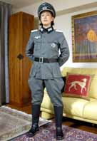 SSか国防軍かどっちにするかものすごく迷って試着しまくったんだけど、店のアンちゃん(ミリ系らしからぬさわやか好青年)の「こっちの方が軍人らしいですよー」というお世辞と、「SS衣装はビジュアル系やSMのヒトも買いにくる」という言葉そして、友人Sさんの「うーん・・・私は○○大佐(某マンガのキャラ)のファンですから・・・うへへへ」という率直なアドバイスに従ってこちらを選択した。