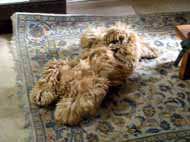 ゴミではない、へそ天スタイル(=あおむけ)を取るマヤっこである。左側のモコモコした部分が後ろ足で、右側のモコモコした部分が前足だ!かまって欲しい時や嬉しい時に取るポーズかと思いきや、真夜中にトイレに起きた時に誰もいない部屋で目をくわっと見開いたまま、へそ天状態でフリーズしていることもあるので、犬の真意は謎のままである・・・・・・。