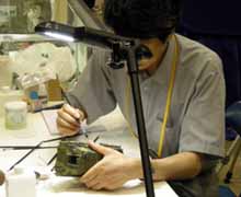 企業スペースで美技を披露するプラモ職人。絵の具のハケをぱっぱっと振って、タンクに細かい汚れをつけていたよ。