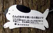 上野の森の樹の根元にくくりつけられていたプレートby東京都健康局。ゆるキャラ系のルックスに似合わず「動物飼育の遵守事項:公共の場所並びに他人の土地及び物件を不潔にし、又は損傷させないこと」と言ってることはバリバリ硬派。