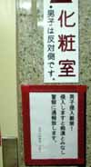 女性客も動員したいなあ、ともくろむ経営側の配慮はトイレにも現れている。「男子侵入厳禁!侵入しますと痴漢とみなし、警察に通報します」えぇーっ?そんなに痴漢多いんか?とかえって不安になる女心をよそに、太ゴシックと赤ビニールテープにて痴漢を威嚇・・・どんな言い訳をしようとも、ぜったい許してくれなさそうだ。