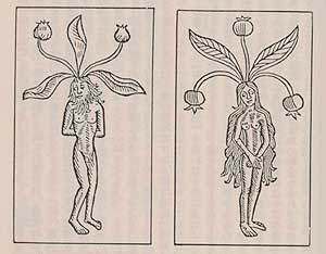 (左)参考図版 マンドラゴラ(マンドレイク)の「男」と「女」 「マンドレイクの名で知られる植物は動物の王国の国境に位置する。引き抜くと声を上げるからだ。この叫び声を聞いた者は気が狂う。(中略)『ユダヤ戦記』最終巻でフラウィウス・ヨセフスは、訓練した犬を使うことを勧めている。この植物を掘り出すと犬は死ぬが、葉は催眠剤、緩下剤、その他いろいろ不思議な効用がある。」 (ホルヘ・ルイス・ボルヘス「幻獣辞典」より) |