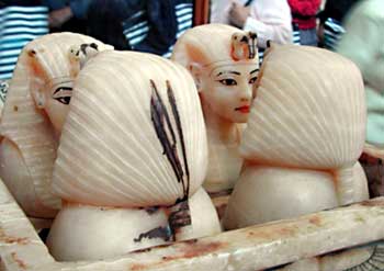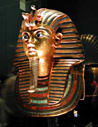 吉村作治先生がある本の中で書いておられた。 「極大の美」であるカルナックやアブシンベルの大神殿と並んで、初めてのエジプト旅行のもう一つの大きな目的は、「極小の美」である精緻を極めた工芸品を所蔵するこの「カイロ博物館」を訪れることだった。 30万点とも言われる古代エジプトの遺物を擁し、まともに見ていると数ヶ月は要するというこのエジプト芸術の聖地は、その日も世界中からやってきた観光客でイモの子を洗うよう。その混みっぷりになんかデジャヴがあるなぁと思ったら、それは阪神大震災の直後の銭湯の混み具合なのだとハタと気付いた・・・ そしてその聖地に一歩足を踏み入れた第一印象はといえば・・・ ーと、ガンプラを部屋中に散らかすガンダムマニアの妻の気分。博物館と言うよりは「理科実験室」の趣で、そのテキトーさが実にエジプト的と言うべきか何というか。 日本の博物館ならば警備員が物々しく付き添っているような素晴らしき黄金の遺物が、やっと間を通れる位のスペースにみっちりと並んでおり、ガラスケースの中の小さな工芸品もただ棚に雑然と並べてあるだけ。おまけに一つ一つの展示品にも説明の札などほとんど付いていないときては、こりゃガイド無しではキツイなぁ。 そんなカオスに身を投じた我々のグループに与えられた時間はわずか2時間。それも内一時間以上は団体行動で、好きなもん見られる自由時間は45分・・・ 私はその自由時間の短さを知った瞬間、鑑賞は次回に持ち越すことにして、土産物を求めてミュージアムショップにきびすを返していた・・・ とはいえ、添乗員付の一時間強で、取りあえずミイラ室やツタンカーメンの王墓からの発掘品はざっと見て回ることが出来たよん。