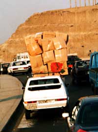 (←)エジプトには積載重量という観念は存在しない。 その後の開館までの約1時間半、通勤客が溢れる地下鉄駅や、博物館をガードするシェパード犬の脱糞シーンや、20年前から軒先に下がったままのムームーを並べている熱海の土産物屋にも似た、趣深い洋品店を鑑賞・・・ そんなあんまし楽しくないカイロ散策でヒマを潰し、最後は時間を持てあましてしょぼい公園の、今にも土に還りそうな崩壊寸前のベンチから、道行く人を観察する不気味な東洋人を演じたりしていた。 でもそんなに長いことウロウロしていた割に、5分おきに絨毯売りに声を掛けられるイスタンブールと違って、カイロはほとんど声を掛けてくる人間がいなかったのにはちょっとびっくり。まぁ時間的なものもあったのだろうが・・・ 声を掛けてくる人といえば、人数が多すぎてヒマを持て余している若い警官たちのみ。"Can